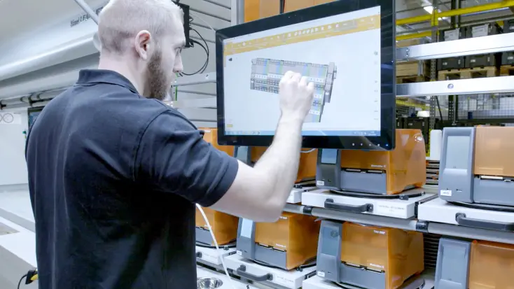 Pour Deutsche Accumotive GmbH & Co. KG, Armbruster Engineering assure la production selon de systèmes de stockage d'énergie stationnaires. En raison de l'utilisation d'ELAM, l'instruction de travail numérique appropriée est affichée à tout moment sur le poste de travail d'assemblage. En outre, un test de fin de vie et une station d'emballage sont équipés d'ELAM. Les modules Pick to Light guident les employés pas à pas dans les process de travail. En outre, le système ELAM enregistre tous les composants installés et stocke les étapes de travail et les valeurs de mesure correspondantes afin d'assurer des produits fiables et durables. ELAM garantit qu'aucune étape de travail n'est oubliée et que tout est bien fait.